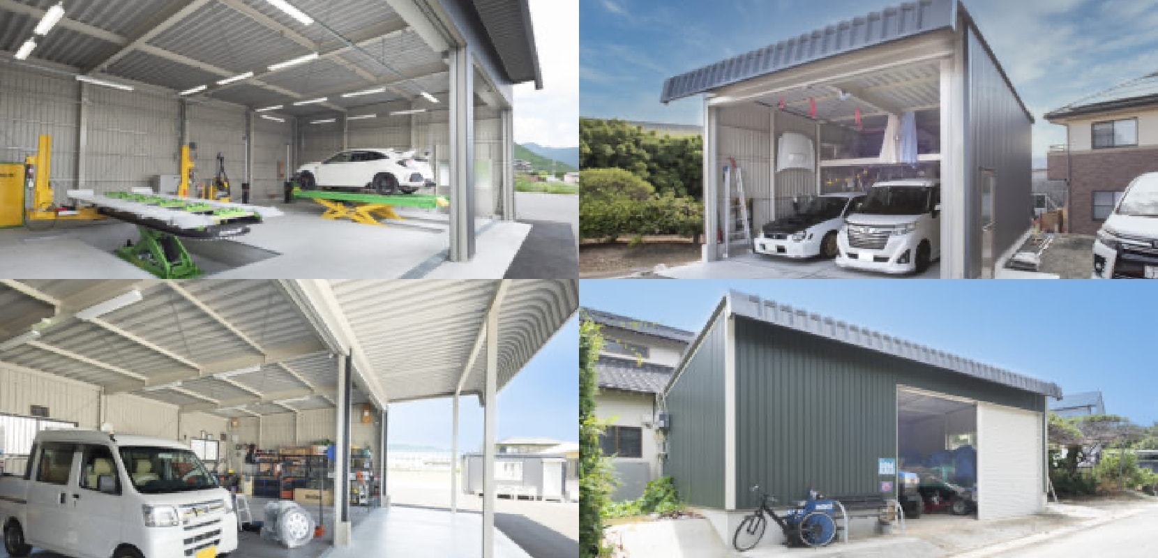 「広スペースハウス」「HHD」「B-CANO」それぞれの特長で、作業場・ガレージ・秘密基地・カーポートなど多様なニーズをカバーします。