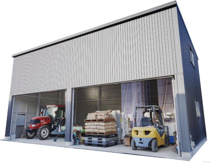背の高い農機具や工場機械でも楽々入る最大6mの軒高。倉庫だけじゃなく工場や作業場などにも最適です。