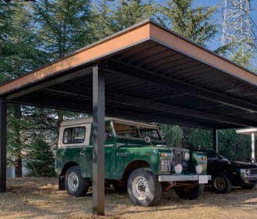 見たからにごっつくて骨太なカーポート。梁は全て頑丈なH鋼を使用。開口部が広いので全面からも横からも車の出し入れがスイスイ!